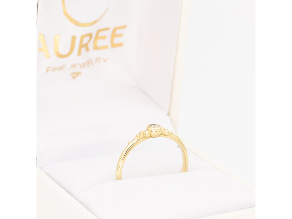 Jemný prsten z 14kt žlutého zlata s diamantem zasazeným v centrální „bublině“. Kolekce Bubbles působí hravě, přesto elegantně – ideální volba pro ty, kdo mají rádi originální minimalismus s nádechem luxusu.