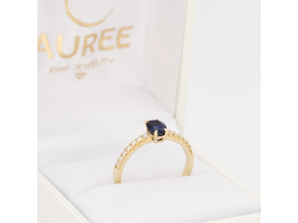Elegantní prsten z žlutého zlata 585/1000 s oválným safírem o rozměru 4,5 × 6,5 mm, zasazeným do čtyř krapen, které nechávají vyniknout jeho syté modré barvě. Po obvodu obroučky je čtrnáct drobných diamantů precizně osazených ve fasování typu fishtail, které prstenu propůjčuje jemný třpyt a hloubku.